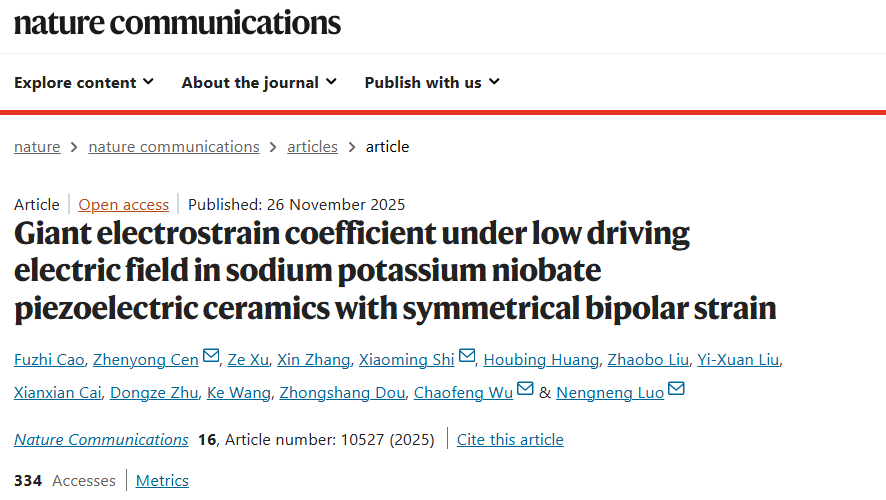科研团队研发出具备超低驱动电场和巨应变系数的铌酸钾钠无铅压电材料,性能超越当前主流的铅基压电体系,在高精度微型器件应用领域上展现出巨大的潜力。该成果以 “Giant electrostrain coefficient under low driving electric field in sodium potassium niobate piezoelectric ceramics with symmetrical bipolar strain”为题,发表在国际知名期刊《自然·通讯》(Nature Communications, 2025, 16, 10527.)上。寸止挑战