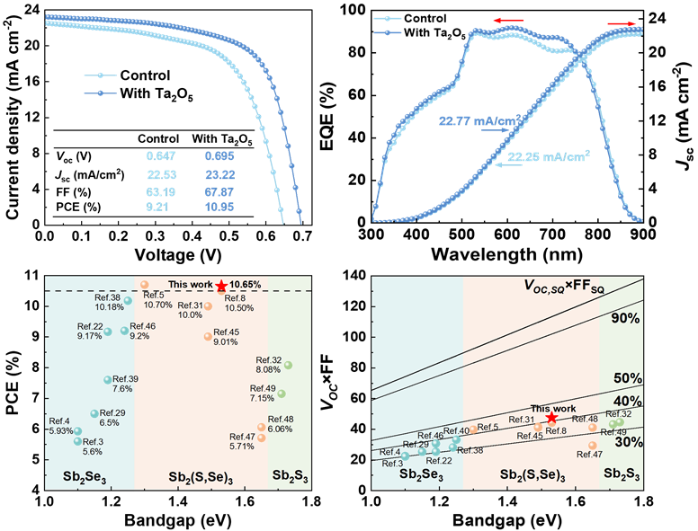 Sb2(S,Se)3作为一种新兴的光伏材料,因其具有高稳定性、低毒性、带隙可调和出色的光电性能而展现出巨大潜力。目前,高效Sb2(S,Se)3太阳电池通常直接沉积在硫化镉(CdS)衬底上。然而,CdS/Sb2(S,Se)3界面处不利的能带排列导致严重的载流子复合和开路电压损失,从而限制Sb2(S,Se)3太阳电池的光电转换效率。针对该问题,本团队提出了一种场效应钝化策略,通过在CdS/Sb2(S,Se)3之间引入低功函的Ta2O5介电层。Ta2O5层不仅作为生长高质量Sb2(S,Se)3薄膜的理想衬底,而且显著改善了界面电荷传输特性。Ta2O5中的固定正电荷增强了内建电场,促进电子的提取,同时抑制界面处空穴的积聚,从而降低界面处的载流子非辐射复合。基于此策略,锑化物太阳电池实现了10.95%的光电转换效率(认证10.65%)和695 mV的开路电压。该物理钝化策略为优化异质结质量和抑制开路电压损失提供了有效途径,对实现高性能光伏器件具有重要意义。