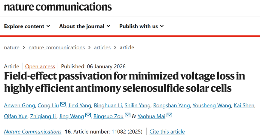 邹炳锁教授领衔的纳米光子学材料与技术团队在硒硫化锑(Sb2(S,Se)3)太阳电池领域取得新进展,相关成果以“Field-effect passivation for minimized voltage loss in highly efficient antimony selenosulfide solar cells”为题,发表在国际顶级期刊自然通讯 (Nature Communicatios)。资环材寸止挑战