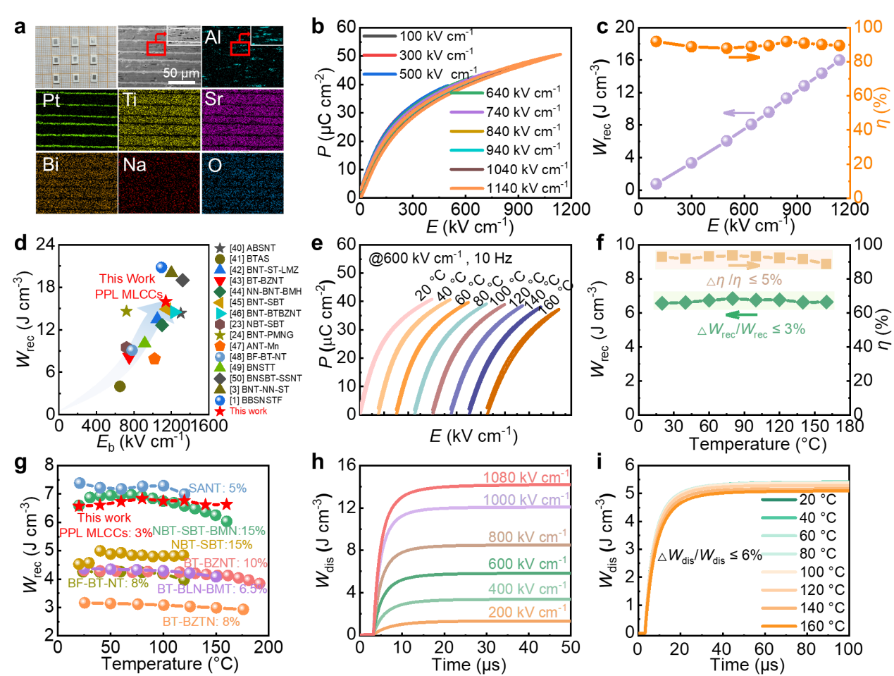 罗能能教授团队提出一种全新策略:在无铅弛豫铁电基体中嵌入平行排列的Al2O3片状模板,构建大量有序排列的异质界面。在强电场和高温条件下,这种有序异质界面能有效抑制电荷注入和传输,显著降低电导率与能量损耗,从而实现高击穿强度与高热稳定性。基于该结构,复合块体陶瓷的击穿强度和储能密度分别提高2.6倍和2.2倍,储能密度在20℃-160℃的变化率从~10%降低至~2%。值得注意的是,以该电介质材料制备的MLCCs的击穿强度高达1140 kV cm-1,储能密度达16.0 J cm-3。此外,该MLCCs在20℃-160℃的宽温范围内表现出优异的热稳定性,性能波动幅度不超过3%。这些结果表明,有序异质界面工程在开发兼具高热稳定性和高储能密度的材料方面具有重要潜力。