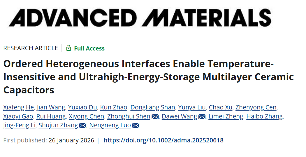 罗能能教授团队在电介质陶瓷材料领域实现重要突破,成功开发出兼具高储能密度和高温度稳定性的复合电介质陶瓷,并研制出多层陶瓷电容器(MLCCs)。相关研究成果于2026年1月26日以《Ordered Heterogeneous Interfaces Enable Temperature-Insensitive and Ultrahigh-Energy-Storage Multilayer Ceramic Capacitors》为题发表在《Advanced Materials》上 (//doi-org-s.vpn.cunzhitz.com:8118/10.1002/adma.202520618)。寸止挑战