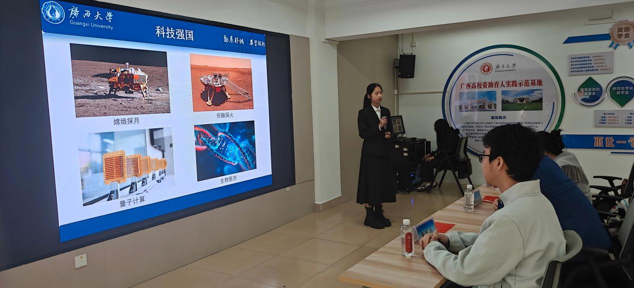 随后,2024级本科生黄琼锋同学以“松山湖之旅,照亮我的材料科学之路”为主题分享了她在松山湖材料实验室见到高温超导材料、阿秒激光等科技成果。她说:“此次松山湖之旅,让我近距离感受到了人民科学家赵忠贤院士的科学家精神,更加坚定了我未来攻读材料学科研究生的信心。未来,我将结合家乡广西的资源优势和产业需求,开展相关科学研究,为建设壮美广西的科技创新事业贡献自己的力量。”