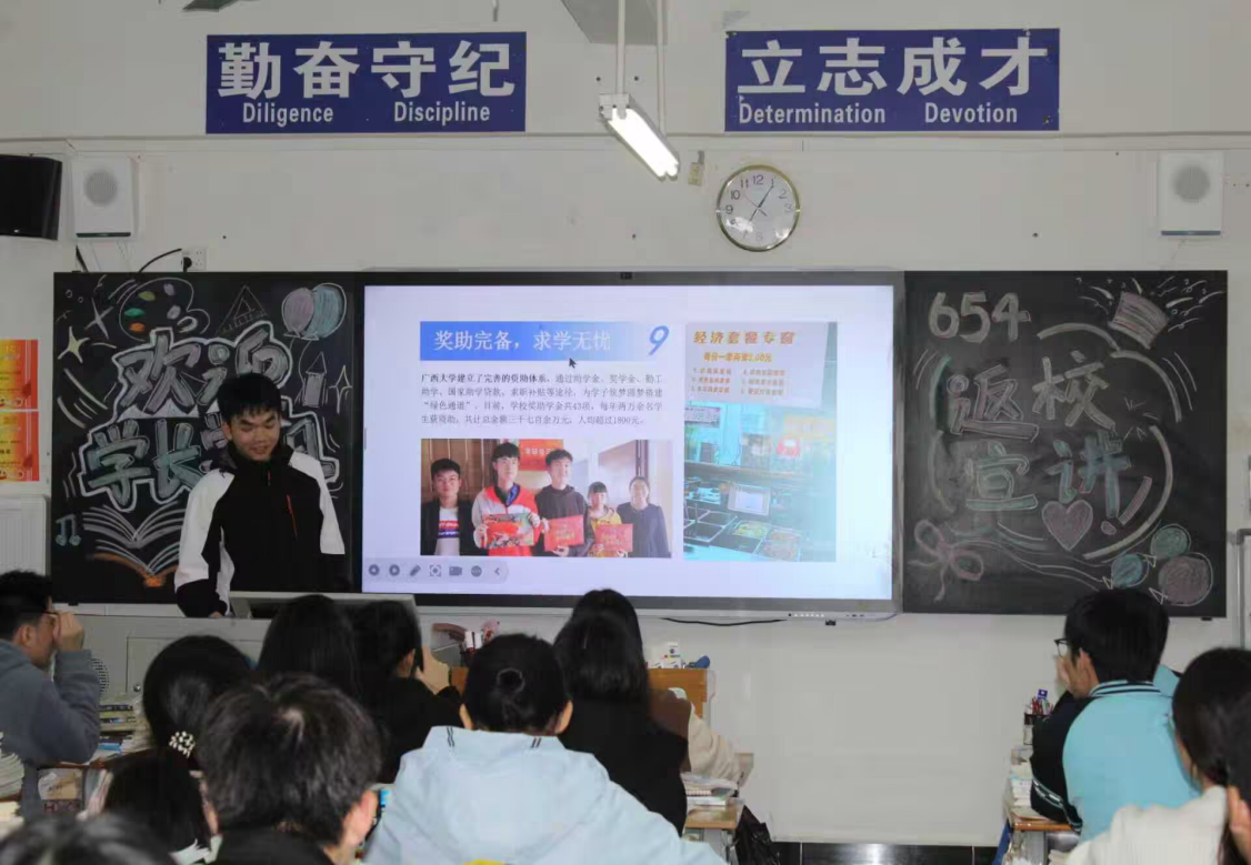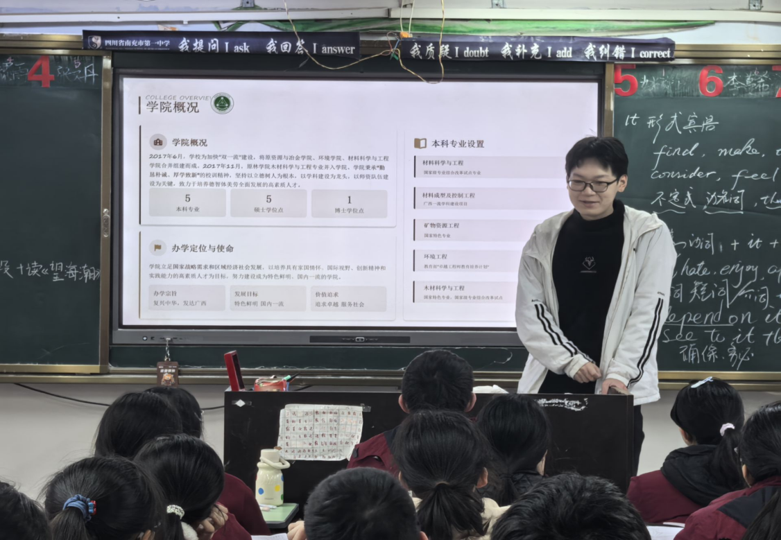 同一天,材科243班黄玥玲与环工252班谭倍倍携手走进大化高中,通过分享自己在西大的成长故事,为学弟学妹们勾勒出大学生活的精彩画卷。从课堂学习到社团活动,从科研实践到志愿服务,她们的讲述让在场学子对西大充满了憧憬。