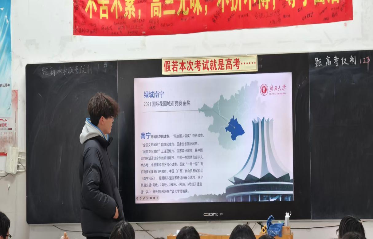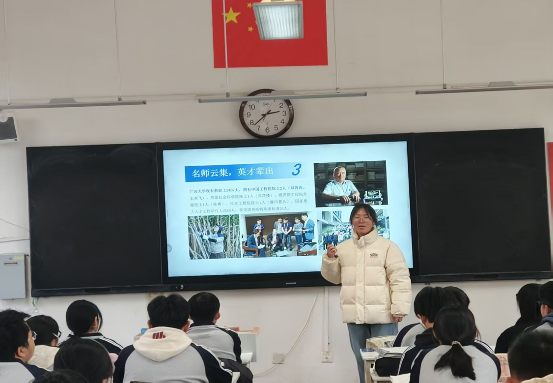 2月5日下午,环工251班邓喆回到母校南宁市第二中学,与学弟学妹们面对面交流大学生活的精彩点滴,分享高效备考的学习经验。从西大的优势学科到丰富的校园文化,从资助政策到成长路径,让更多二中学子对西大有了全面而立体的认识。“我们不仅分享故事,更希望传递一份信心,激励更多优秀同学选择西大、圆梦西大,”邓喆如是说。