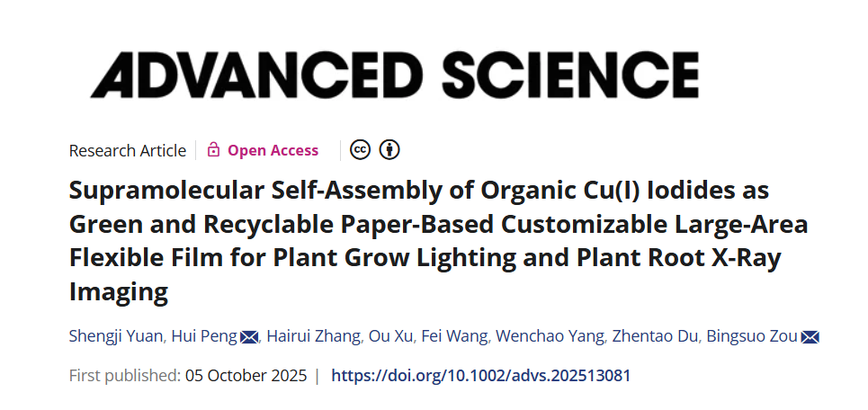 该团队通过超分子自组装策略,成功开发出一种基于滤纸和有机铜碘化物的可定制、大面积、可回收、可生物降解的柔性发光薄膜,并成功构建了一个集植物生长照明与植物根部X射线成像于一体的双功能平台。该研究成果以题为《Supramolecular Self-Assembly of Organic Cu(I) Iodides as Green and Recyclable Paper-Based Customizable Large-Area Flexible Film for Plant Grow Lighting and Plant Root X-Ray Imaging》发表于国际顶级学术期刊《Advanced Science》(IF = 14.1),彭辉博士和邹炳锁教授为共同通讯作者,硕士研究生袁升记为第一作者。寸止挑战